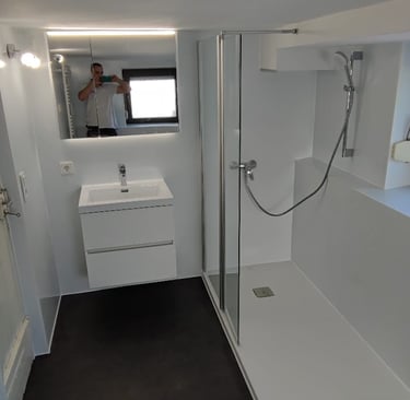 Im ehemaligen Wannenbereich, werden Großformatfliesen verbaut, welche Fugenlos sind, dies erleichtert die Reinigung und Pflege.