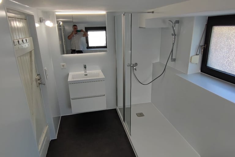 Neuartige, moderne Verlege-und Einbautechniken bedeutet für Sie deutlich weniger Schmutz und Lärm. Neuartige Wandelemente werden direkt auf den Fliesen befestigt. Die stabile Struktur dieser Elemente, erlaubt es diese sehr dünn zu fertigen, so dass sie kaum Platz beanspruchen.
